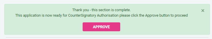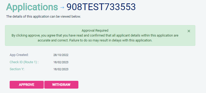 To Approve and submit an application, click on the pink Approve button within the green box.