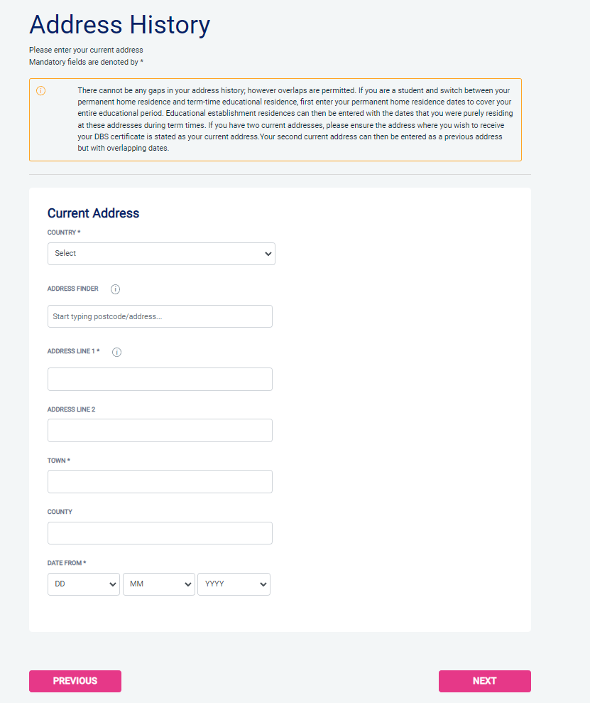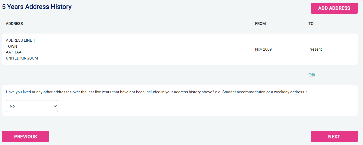 In this section you need to give a complete address history for the last five years including a full postcode.