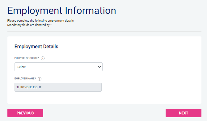 If the purpose of the check is employment (either voluntary or paid) you will need to enter your 'Position Applied For' and 'Employment Sector'.