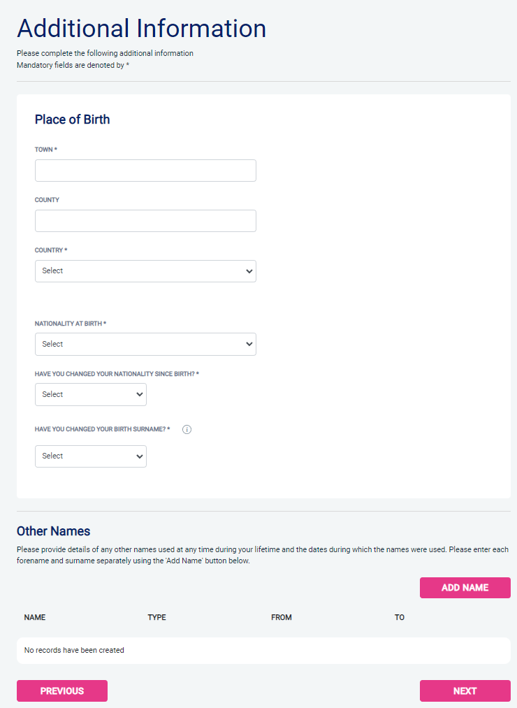 If you have changed your surname, you must provide your birth surname and the year you changed it. Where names have changed they should run in date order with no gaps.